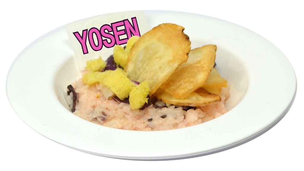 陽泉高校の明太クリームポテト&まいう棒リゾット(880円)陽泉高校をイメージした明太クリームのリゾットです。紫原の好きなスナック菓子をトッピングし、トレヴィス(紫キャベツ)を散らしました。
