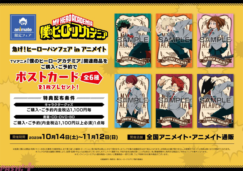 期間中にTVアニメ『僕のヒーローアカデミア』関連のキャラクターグッズを購入・予約内金税込1,100円毎、書籍・CD・DVD・BDを購入・予約(内金税込1,100円以上必須)1点毎に、新ビジュアルでデザインされた【ポストカード(全6種)】が1枚もらえます。