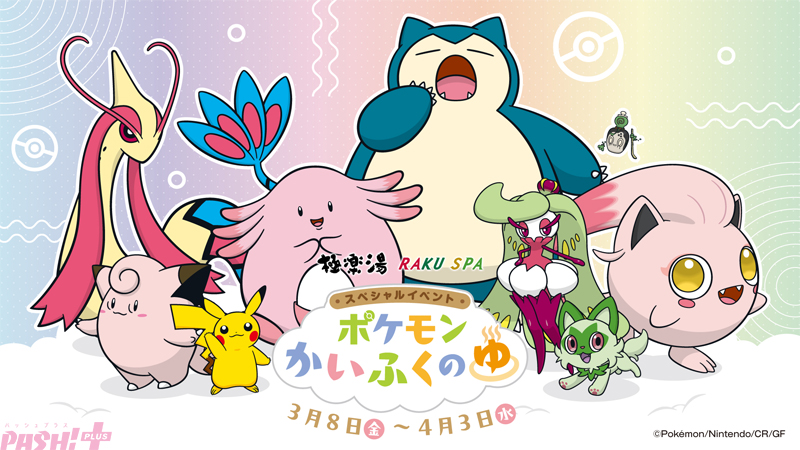 極楽湯は2024年3月8日(金)より極楽湯RAKU SPAグループ32店舗で、ポケモンのゲームやカードで登場する“かいふく”をテーマにしたスペシャルイベント“ポケモンかいふくのゆ”を開催します。