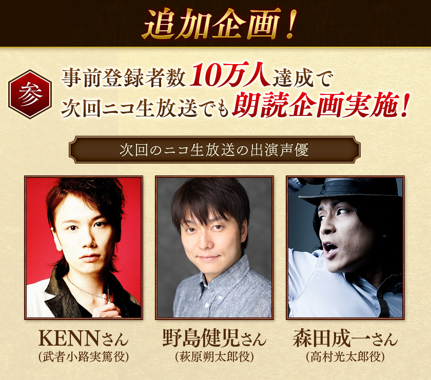 リリースまでに事前登録者数が10万人を超えれば、第1回ニコ生でご好評頂いた「出演声優による朗読企画」を、第2回公式ニコ生放送でも実施します。
