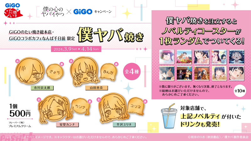GiGOのたい焼きにて、『僕の心のヤバイやつ』に登場する市川京太郎、山田杏奈、半沢ユリネ、安堂カンナが可愛らしいたい焼きになります。1点購入ごとに場面写コースターをランダムで1枚進呈します。