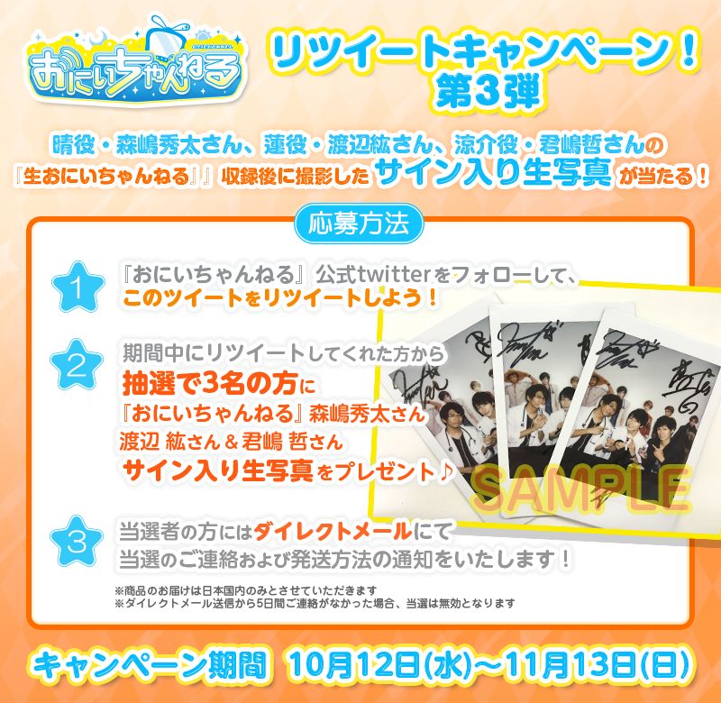 そして、キャストのサイン入り生写真が当たるリツイートキャンペーンも実施中。公式Twitterをフォローして、キャンペーン対象ツイートをリツイートした人のなかから3名に公式生放送『生おにいちゃんねる』第3回に出演した晴役・森嶋秀太、蓮役・渡辺紘、涼介役・君嶋 哲のサイン入り生写真が当たる。