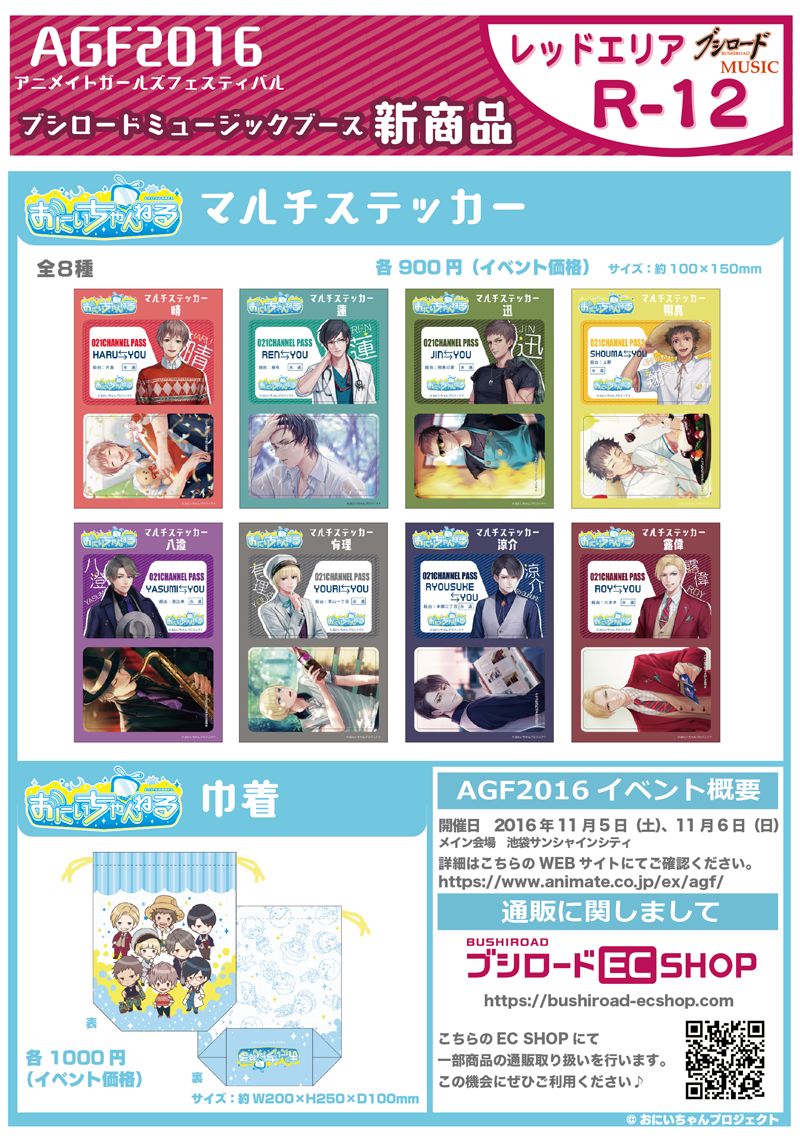 2016年11月5日(土)・6日(日)に開催されるAGF2016では新作グッズの巾着とマルチステッカーが登場し、メッセージ缶バッジとアクリルスタンドキーホルダーの再販される。また、11月4日(金)からはアドアーズ サンシャイン店とのコラボが開催され、作品のイラストを使用した限定缶バッジがプライズとして投入され、クレーンゲーム機に500円を入れると全5種類のイラストカードから1枚もらうことができる。さらに『おにいちゃんねる』公式Twitterをフォローしていることがわかる画面を提示すると、おにいちゃん全員集合イラストカードもプレゼント。くわえて店内では晴、蓮、迅、翔真、八澄、有理のスタンディパネルも展示されるのでお近くの人は足を運ぼう。