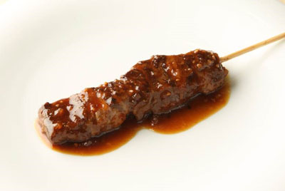佐藤拓也さんがソースの分量からソースに合う調味料までこだわって選んだ牛串焼きです。ソースは、ガーリック&オニオンのステーキソースにバルサミコソースをブレンド。最後にコショウをかけてできあがり