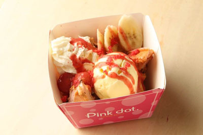 梶さん、代永さんが具材やトッピングを考えた最強のワッフルボウル。ストロベリーワッフルにバナナとアイス、生クリームをトッピング。さらにソースはラズベリーソースとチョコソースのダブルソースです。