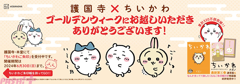 東京都文京区の大本山・護国寺にて、期間中『ちいかわ なんか小さくてかわいいやつ』6巻特装版の「なんか光ってて旅したくなるご朱印帳」を持参の上、ご朱印代(500円)をお納めいただくと、通常のご朱印に加え「ちいかわ印」を押してもらえる「護国寺 ちいかわご朱印イベント」。