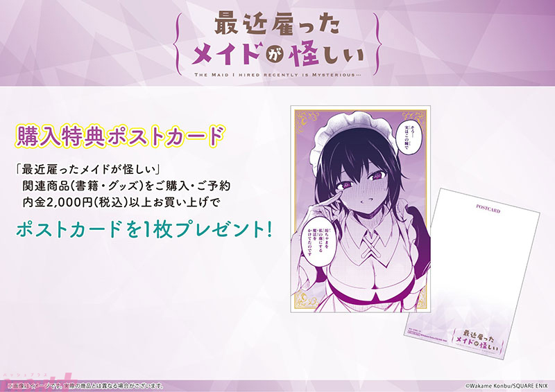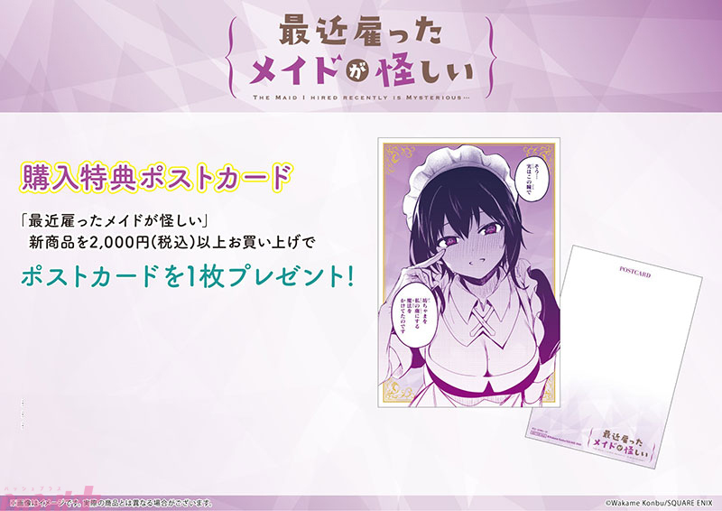 期間中に会場内にて『最近雇ったメイドが怪しい』関連商品(書籍・グッズ)を2,000円(税込)以上、予約又はお買い上げで特典ポストカード(全1種)を1枚プレゼント!