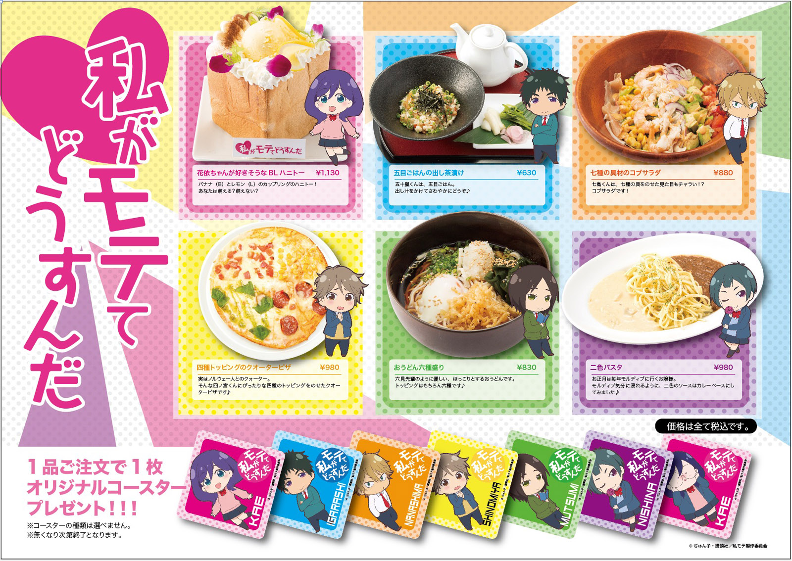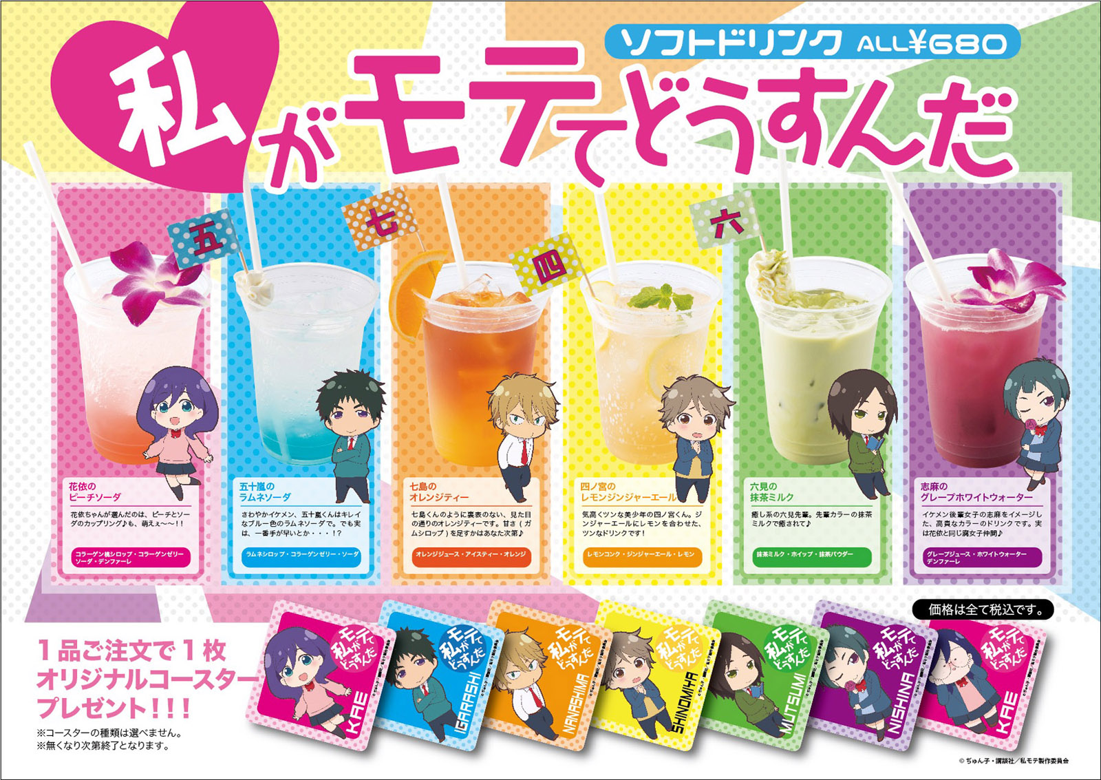 このコラボ企画は、現在秋葉原の2店舗にて開催されており、「カラオケパセラ マルチエンターテイメント ハニトーカフェ」で開催中の「コラボカフェ」では、『私がモテてどうすんだ』の登場キャラクターである、芹沼花依、五十嵐祐輔、七島 希、四ノ宮隼人、六見遊馬、二科志麻の6人をイメージしたフード&ドリンクメニューが用意されており、1品注文するごとにキャラクターが描かれたオリジナルコースター1枚がプレゼントされる。