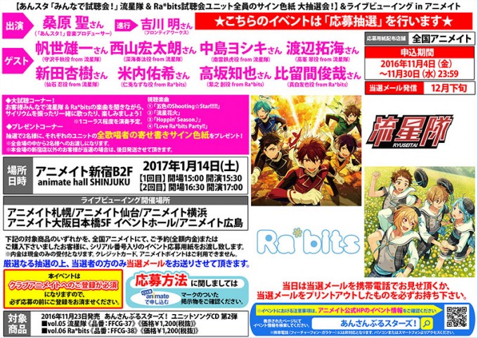 2016年11月23日(水)に『あんさんぶるスターズ!』ユニットソングCD第2弾 vol.05 流星隊、vol.06 Ra*bitsが発売されるのを記念して、リリースイベント『あんスタ「みんなで試聴会!」流星隊 & Ra*bits試聴会ユニット全員のサイン色紙 大抽選会!』が開催される。