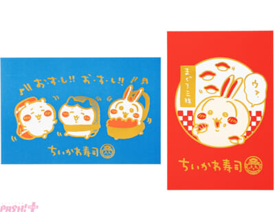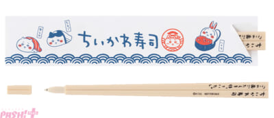『むちゃうま!!ちいかわ寿司』で商品購入のお客様には、「レンチキュラーカード(全4種) (非売品)」を2,200円(税込)お買い上げ毎にランダムで1枚プレゼント。また、商品購入4,400円(税込)以上の方には、「わりばし型ボールペン (非売品)」を1人1会計につき、1本プレゼント。