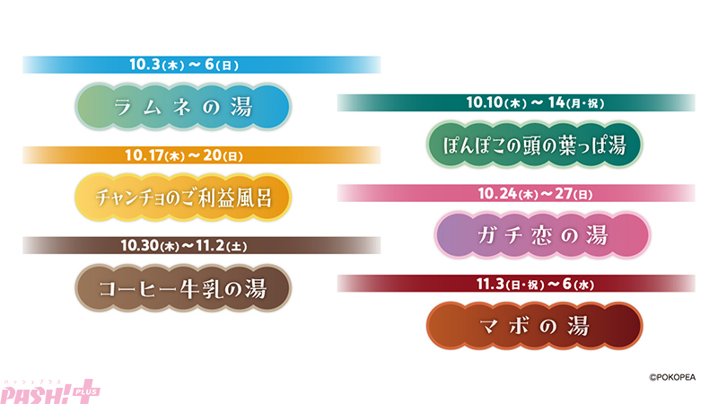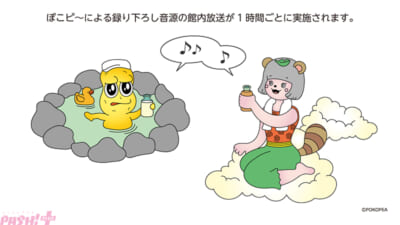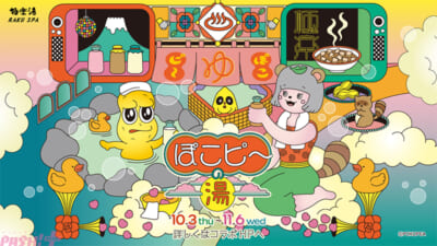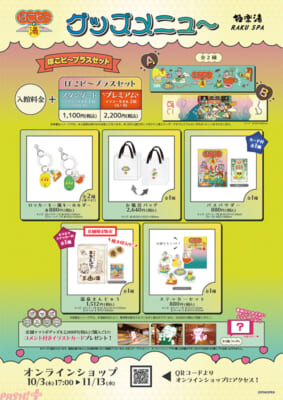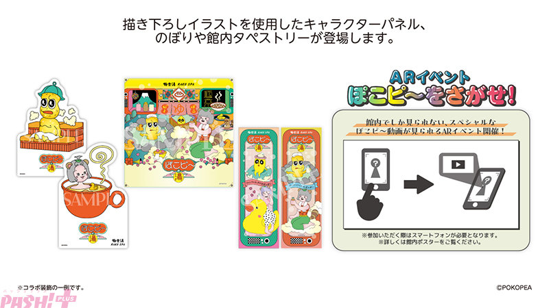 店舗限定のマフラータオル「ぽこピ~プラスセット」やコラボグッズ(店舗購入特典有り)、コラボメニュー(コースター付き)が販売される他、ぽこピーたちが選んだ6種類のコラボ風呂、ぽこピーたちによるオリジナル館内放送が展開します。