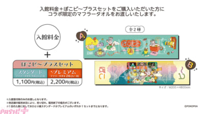 店舗ご入館時に、入館料金+ぽこピ~プラスセットの料金をお支払いいただいた方に、描き下ろしビジュアルを使用したコラボ限定マフラータオルをお渡しします。