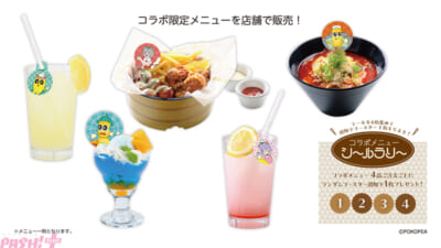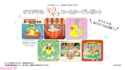 ぽこピーたちをイメージしたコラボメニューを店舗で販売します。ご注文いただいた方に、キラキラコースターをランダムでプレゼントします。