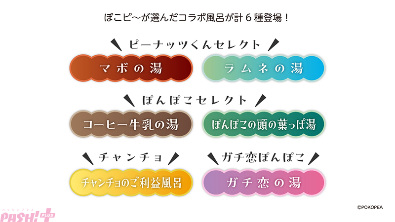 ぽこピーが選んだが6種類のコラボ風呂を開催します。開催中は特別にデザインしたタペストリーを浴室に装飾します。