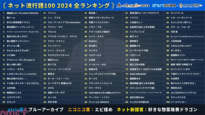 2018年にスタートし、今年で7回目の開催となった「ネット流行語 100」では、「ニコニコ大百科」「ピクシブ百科事典」の各単語ページにおけるアクセス数の昨年比に基づき、今年ネットで最も流行った100単語をノミネート。12月18日(水)の表彰式では、全100単語のランキングと年間大賞のほか、ニコニコ賞とpixiv賞、ネット新語賞の各受賞単語が発表されました。