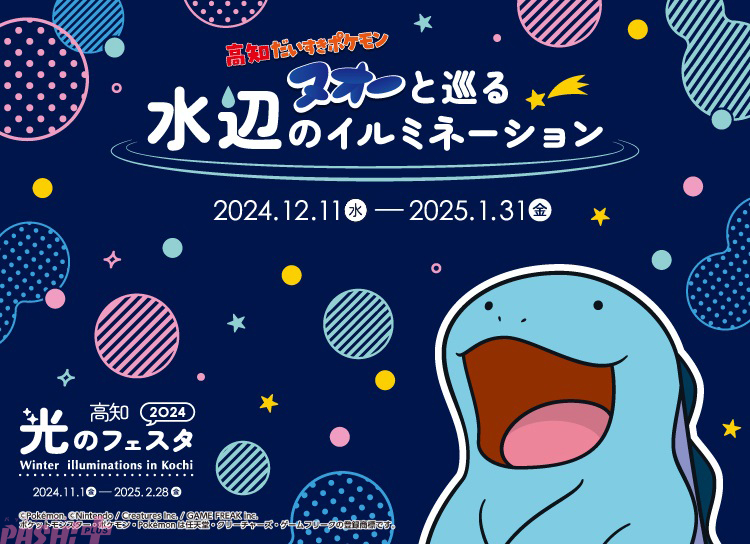 高知県とポケモンの連携協定による取り組みの一環として、2024年12月11日(水)~2025年1月31日(金)の期間『「高知だいすきポケモン」ヌオーと巡る水辺のイルミネーション』が開催されます。
