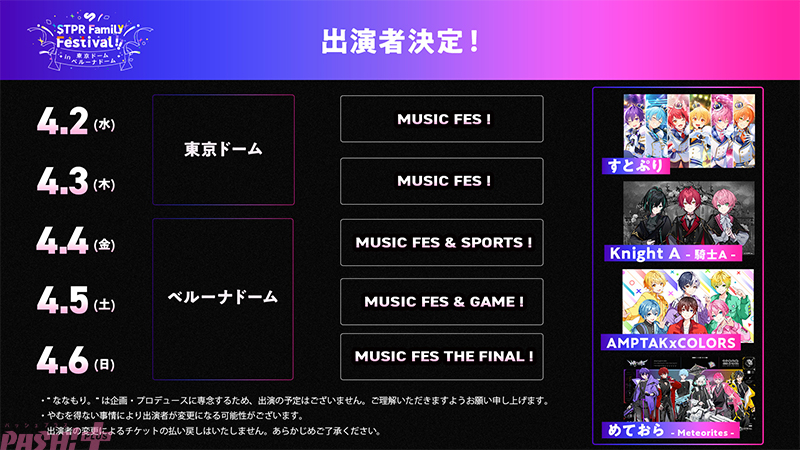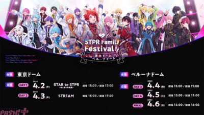STPRは、「すとぷり」「Knight A – 騎士A -」「AMPTAKxCOLORS」「めておら – Meteorites -」など、所属のクリエイターが集結する大型ライブフェス『STPR Family Festival!!』の出演者・公演概要・プレミアムグッズなどの情報を公開するとともに、オフィシャルチケットの東京ドーム&ベルーナドーム同時限定受付を開始しました。
