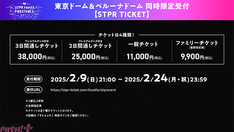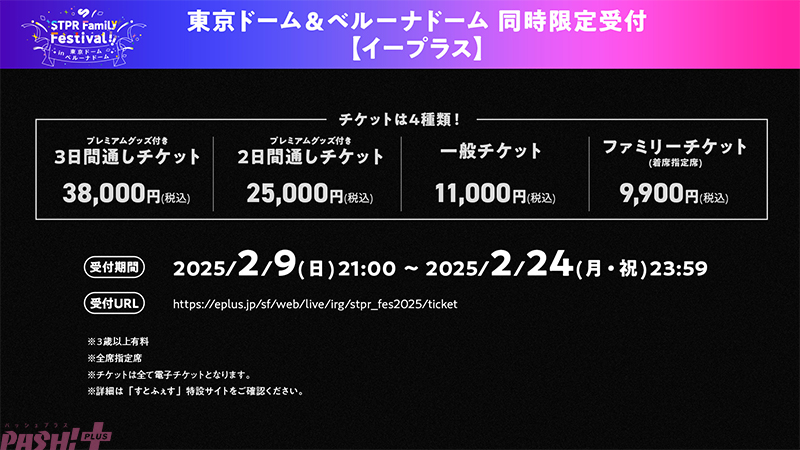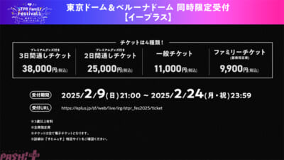 東京ドーム&ベルーナドーム同時限定受付は、2025年2月9日(日)21:00より公式ファンクラブ、STPR TICKET、イープラスにて申し込み受け付けが開始されています。