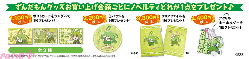 店舗にて『ずんだもん』関連商品の購入金額に応じて、のんたお氏、坂本アヒル氏の描き下ろしデザインによる“オリジナルノベルティ(非売品)”どれか1点をプレゼント!
