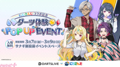 コラボゲームを実際に楽しめるポップアップイベントを開催します。新作ゲーム『にじさんじダーツパーティ』を体験できるプレイスペースやコラボ衣装を身にまとった4名の等身大パネルを設置したフォトスペースをご用意。詳しくはキャンペーンサイトやダーツライブ公式X(旧Twitter)をご覧ください。