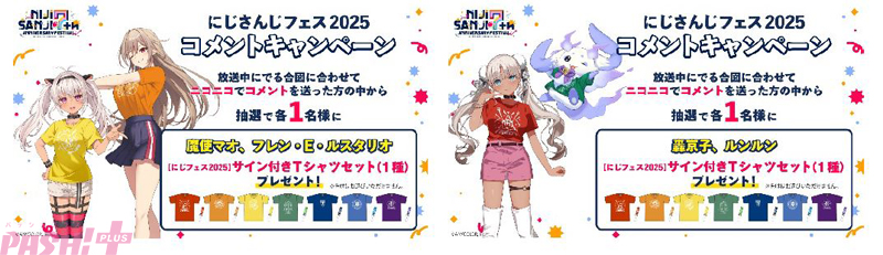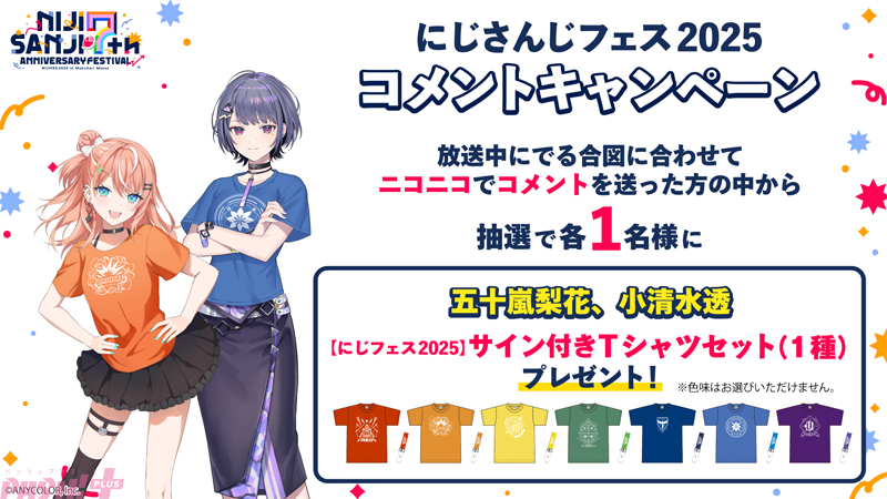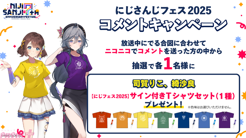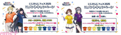 また、番組視聴時のコメント投稿などで参加できる「コメントキャンペーン」(プレミアム会員限定)も実施します。応募期間は各番組タイムシフト視聴期限の 3月9日(日)までとなり、抽選でランダムチェキ風カードやアクリルパネル、サイン入りTシャツなどの豪華グッズが当たります。対象番組は、「にじさんじフェス 2025 実行委員だより -前日 SP-」や「【直前放送】七次元生徒会! ~前夜祭ステージ、使わせていただきます!~ 会場突撃レポート」などの7番組です。