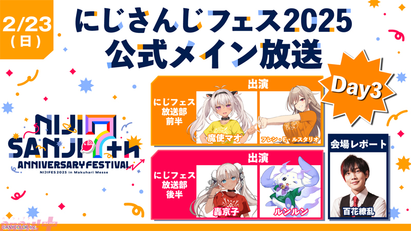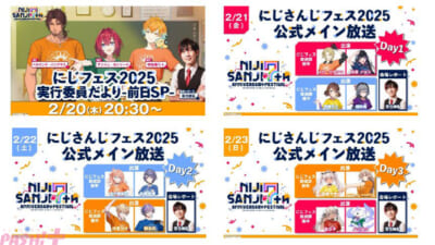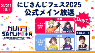 イベント前日の2月20日(木)に実施される「にじさんじフェス 2025 実行委員だより -前日 SP-」では、開幕に先駆けて、会場の各ブース、グッズ、飲食などを紹介します。イベント期間中の2月21日(金)~2月23日(日)の3日間それぞれ朝から夕方まで行われる「にじさんじフェス 2025 公式メイン放送」では、会場の様子や雰囲気を1日通して紹介する「にじフェス放送部」や、着ぐるみ&ヒーローショーステージの中継をお送りします。