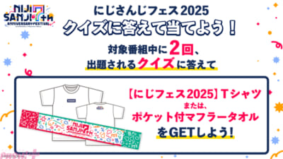 さらに、「にじさんじフェス 2025 公式メイン放送」では、「クイズに答えてにじさんじフェス 2025 グッズを当てよう!」と題し、「ニコニコ Q(クイズ)」回答で応募できるプレゼントキャンペーンを各番組中に2回実施します。応募期間はイベント開催中の2月21日(金)~2月23日(日)までとなり、条件を満たした視聴者の中から抽選で賞品をプレゼントします。