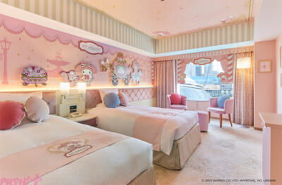 可愛らしさいっぱいの「マイメロディルーム」には、ティーポットの馬車に乗って、ドレスアップして遊園地に遊びにきた「マイメロディ」と「マイスウィートピアノ」の様子が壁一面に施されています。東京ドームシティを見渡す窓際にはフォトフレームとラウンジスペースを設置。バスルーム、クローゼットの鏡など各所にも愛らしい「マイメロディ」の世界観を演出。