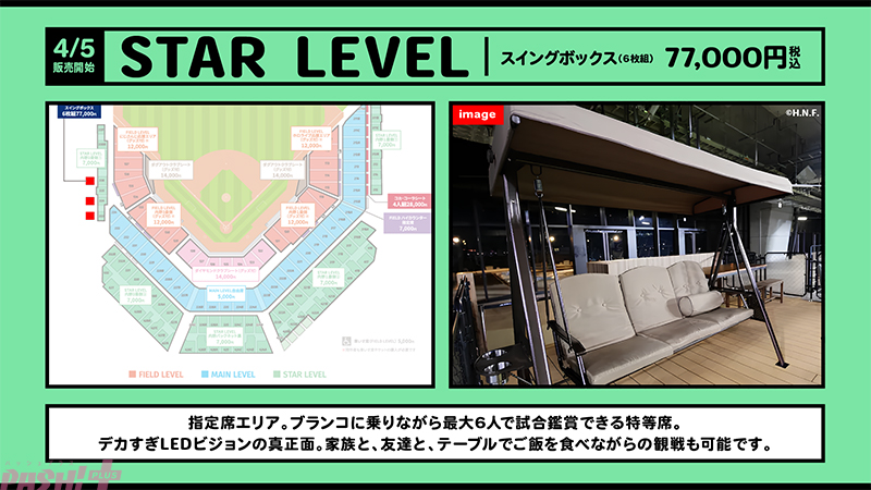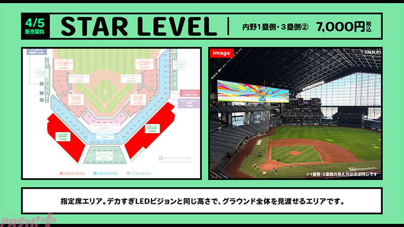 観戦チケット販売第一弾では、にじさんじ・ホロライブの各チームをグラウンド間近で応援することができる「にじさんじ・ホロライブ限定応援席エリア」(FIELD LEVEL)とにじさんじ・ホロライブの各チームを個室空間の中で仲間と一緒に応援できる超VIPエリア「バルコニースイート」(VIPルーム)、2種類の抽選販売を開始します。