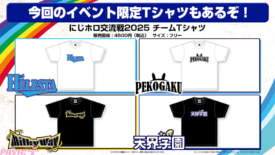 さらに、にじホロ交流戦2025では、『にじさんじ』と『ホロライブ』の夢のコラボレーションを記念した、今回の試みならではの限定オフィシャルグッズを3月24日(月)より販売します。第1弾のオフィシャルグッズ情報では、各出場チームのユニフォーム風チームシャツやチームキャップ、個別応援タオルなど、出場しているチームを応援しながら試合観戦できるグッズをバリエーション豊かに販売します。ぜひ推しのチームのグッズを片手に、手に汗握る白熱の試合をお楽しみください。オフィシャルグッズ情報の第2弾は4月中旬頃に公式サイトや公式Xにて引き続き発信されます。