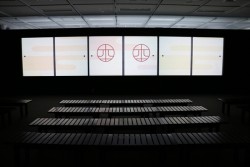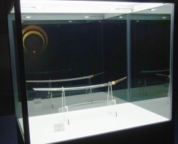 障子窓に板敷の和風な廊下の先には、「三日月宗近の間」が現れます。この間では三日月宗近の作られたばかりの「生ぶ」な状態を復元する『三日月宗近 生ぶ復元プロジェクト』で打たれた影打「復元 三日月宗近 影」が展示されています。また展示されているパネルではプロジェクトについてや製作の過程を知ることができます。今回展示されている影打はまだ試作とのことでしたが、迫力は満点! ぜひ間近でじっくりと鑑賞してください。