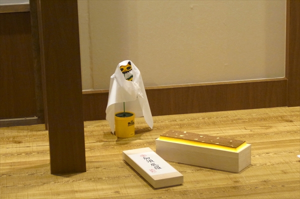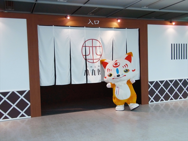 『本丸博』の入口はこちら。私たち取材陣のためにマスコットキャラクター・こんのすけがお迎えしてくれました。この暖簾をくぐったら『刀剣乱舞』の世界へいざ出陣! まずは最初の「歓迎の間」へ。