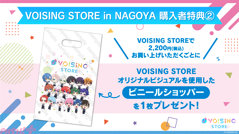 「VOISING STORE in NAGOYA」にて、合計2,200円(税込)お買い上げいただくごとに、「VOISING STORE」オリジナルビジュアルを使用したビニールショッパーを1枚プレゼントします。