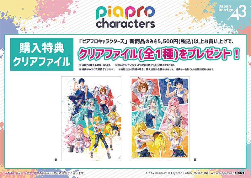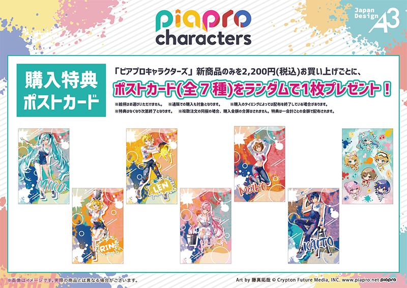 『ピアプロキャラクターズ』の新作グッズをお買い上げいただいた方には、購入金額に応じた特典をご用意しています。新作グッズのみを2,200円(税込)お買い上げごとに、ポストカード(全7種)をランダムで1枚、5,500円(税込)以上のお買い上げで、クリアファイル(全1種)をプレゼント! ここでしか手に入らない限定品なので、ぜひコンプリート目指して集めてみてください!!