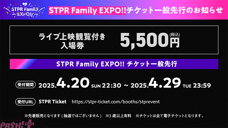 STPR初のイベントとなる『STPR Family EXPO!!』が2025年5月3日(土)・4日(日)にぴあアリーナMMにて開催。4月20日(日)22:30より「ライブ上映観覧付き入場券」の一般先行販売が実施されている他、新たなイベント情報も公開されました。
