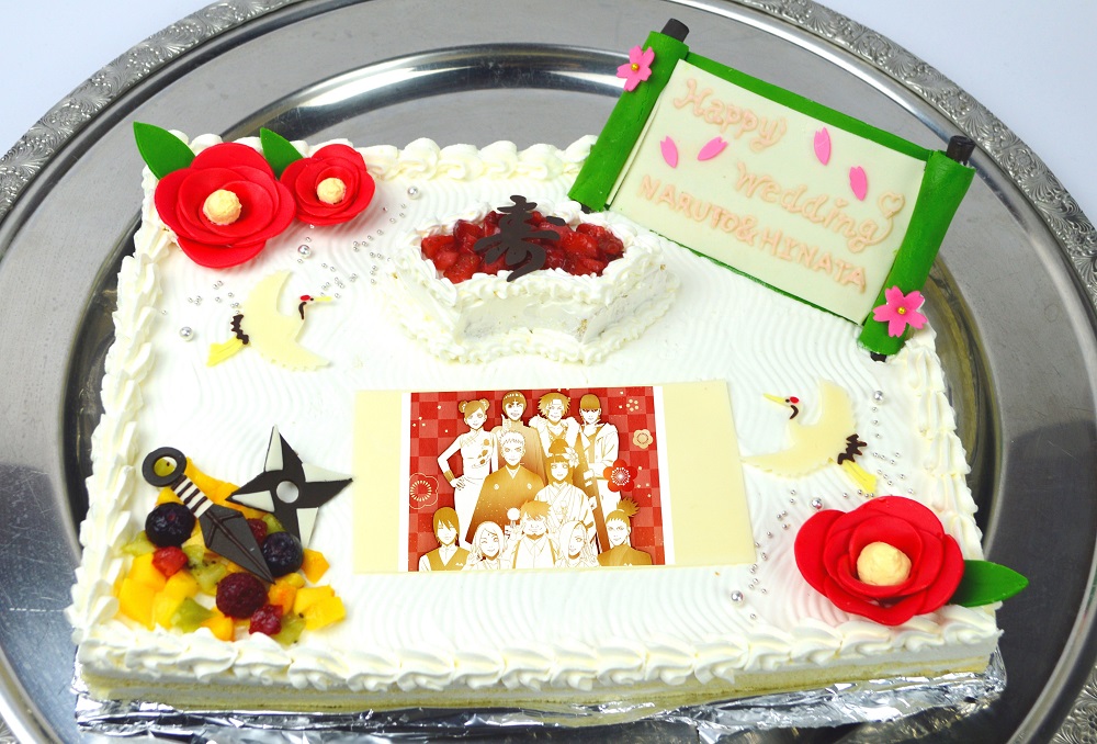 ナルトとヒナタの結婚式をイメージした33cm×24cmのウェディングケーキ。ナルトとヒナタの結婚を祝う巻物や、クナイ、鶴、花などのチョコレート細工を飾りました。
