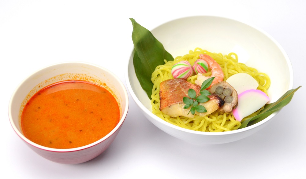 結婚式をイメージした祝言ラーメン(つけめん)。祝いごとに食べられる海老や赤魚を使い、めでたいラーメンを作りました。