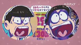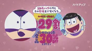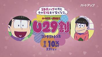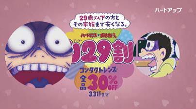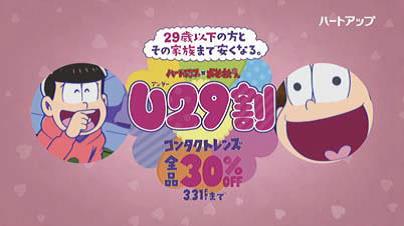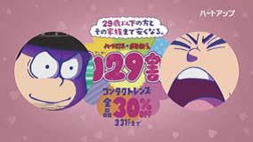 おそ松が「コンタクトのハートアップで、29歳以下の人とその家族まで安くなるアンダー29割やってるよ」と、十四松にオトクなキャンペーン情報を伝えますが、それを聞いた十四松は「アンダー29割? ケータイ会社のマネじゃん!」と余計なことを言います。慌てておそ松は、「それは言っちゃだめでしょ!」とツッコミを入れ、CMは終了します。