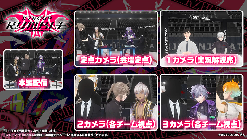 決勝戦/エキシビションマッチはABEMA(アベマ)で全編無料放送。「マルチアングル付き視聴チケット」では通常の本編配信に加え、決勝戦では、「会場定点」「2チーム各視点」「実況解説席」エキシビションマッチでは、「会場定点」「チーム葛葉で2視点」「チームストリーマー視点」の本編配信を含めて5つの視点を切り替えながら楽しめます。
