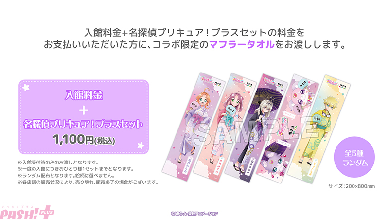 店舗入館時に、「入館料金+名探偵プリキュア!プラスセット」料金をお支払いいただいた方に、描き下ろしイラストを使用したコラボ限定のマフラータオルをお渡しします。