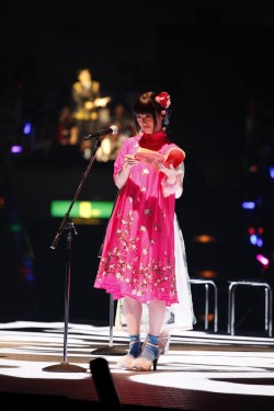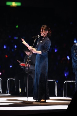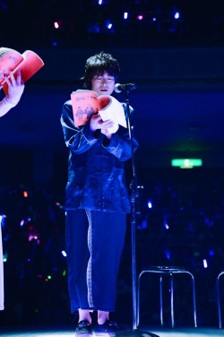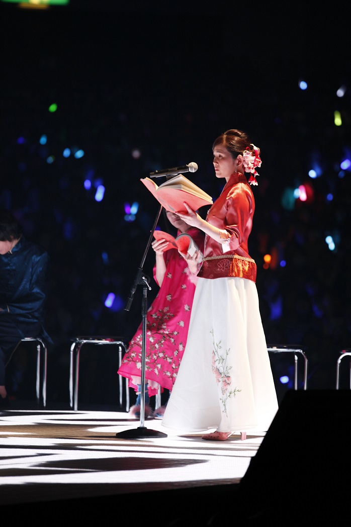 前半は『華祭り』にふさわしく華やかな展開に。女性キャラをフィーチャーしたエピソードの生アフレコや、女性キャストが集まってのトーク「さっちゃんの銀魂いや~んのコーナー』、また実写映画『銀魂』で新八を演じる菅田将暉さん(昼の部)、桂を演じる岡田将生さん(夜の部)からのメッセージや、太田哲治さんとくじらさん(お登勢)の『大銀魂展~ツケが回る前にケツをふけ~』レポートなどレア映像も続々と上映され、会場は春らしくあたたかい空気に包まれます。またイベント恒例の「お通ちゃんライブ」コーナーではお通(高橋さん)、新八(阪口さん)、トッシー(中井さん)がステージで急遽トリオ(?)を結成。お通ちゃん版の『PPAP』や、オリジナルソング『ダイナマイト再開』が披露されたほか、結婚を発表したばかりの高橋さんに対して阪口さんがリードしての「おめでとう!」コールなども起こり、ますますハッピーな雰囲気になりました。
