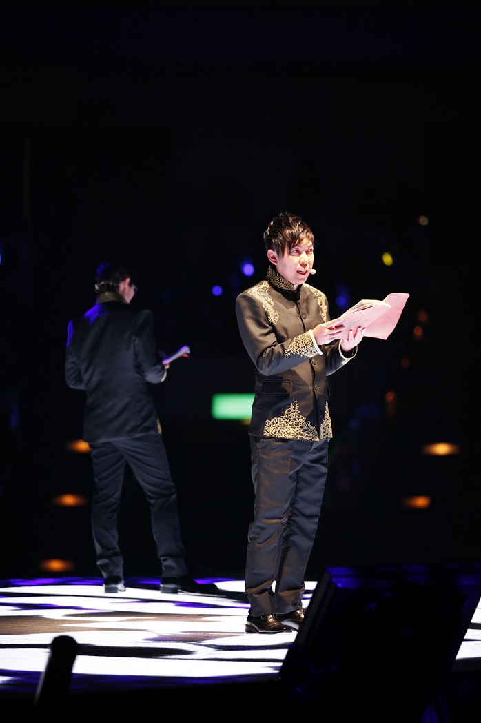 後半に入ると、現在放送中の『烙陽決戦篇』の名シーンをフィーチャーした生アフレコなど、一転して重厚な展開となっていきます。釘宮さんと日野さんの兄妹対決や、杉田さんと関さん(昼の部)、石田さんと小山さん(夜の部)による豪華共演が本編の名場面を再現。さらに『将軍暗殺篇』『さらば真選組篇』を題材にした朗読劇では、真選組メンバーの熱演と華祭りバンドの生演奏が絡み合って男たちの熱いドラマが表現され、会場は感動に包まれます。