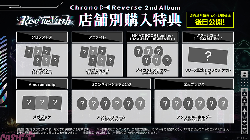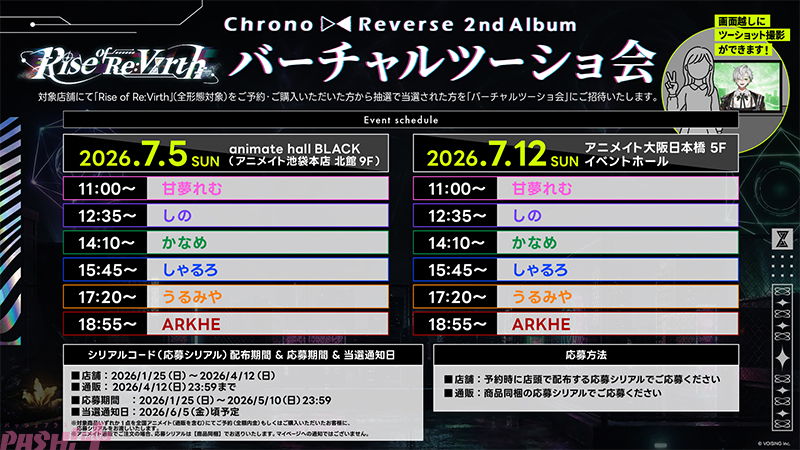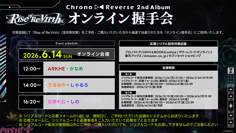 さらに、複数のオンラインストアを対象としたオンライン握手会も実施予定です。前回実施時より当選人数を拡大し、より多くの方がクロノヴァと交流できる機会をご用意いたしました。各店舗では数量限定の予約特典も展開され、詳細は後日発表されます。