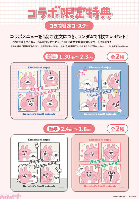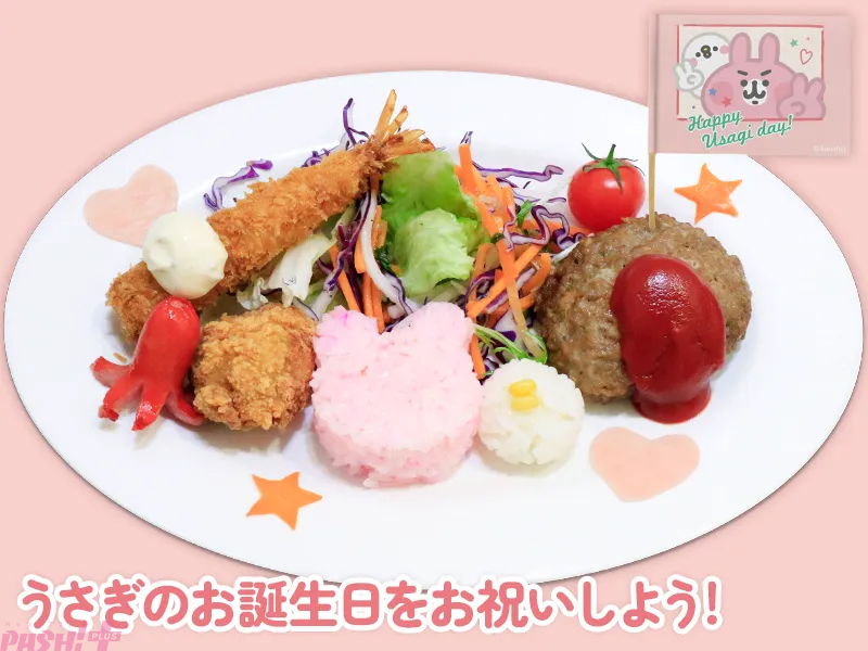 うさぎのかたちの桜でんぶごはんに、さくっとしたエビフライやちょこんと愛らしいタコさんウインナーなど盛りだくさん!の「Happy Usagi day!おたんじょうびエンジョイプレート」をはじめ、「ピスケの笑顔がまばゆいチーズホワイトソースオムライス」や、「ピスケとうさぎのハッピーショートケーキ」「ピスケのおしりパフェ」のほか、ピスケとうさぎたちをイメージしたコラボドリンクがずらりとラインナップ。コラボメニューご注文でもらえる特典【コラボ限定カード(全4種)(前後半で絵柄が変わります)】もお見逃しなく。さらに、2月8日(日)には《特別企画ピスケ&うさぎグリーティング》も実施!
