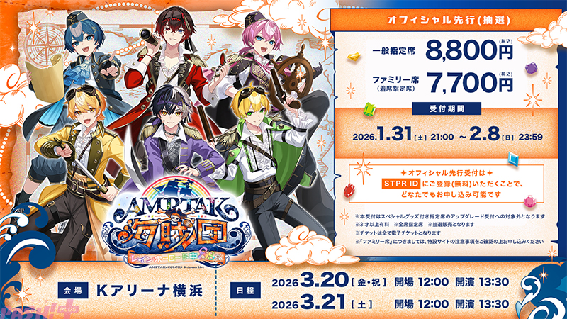 STPR所属の超多才2.5次元歌い手グループ「AMPTAKxCOLORS(アンプタックカラーズ/通称:AMPTAK)」によるワンマンライブ『AMPTAK海賊団xレインボーロード中88%』について、オフィシャル先行受付が2026年1月31日(土)に開始されました。