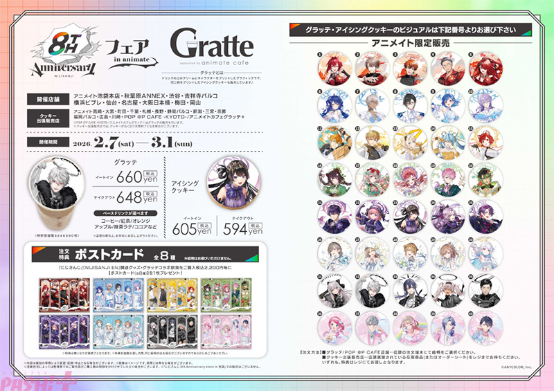 全国アニメイト(通販除く)にて2月7日~3月1日まで開催する「にじさんじ 8th Anniversary フェア in animate」では、期間中、「にじさんじ」「NIJISANJI EN」関連のグッズ・グラッテコラボ飲食をご購入2,200円(税込)毎に、特典「ポストカード(全8種)」を1枚プレゼント。