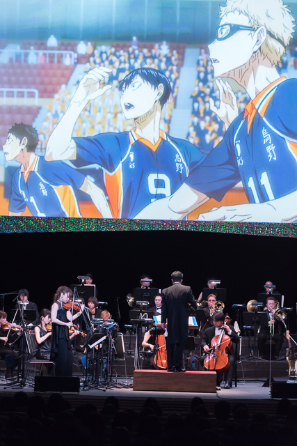 続けて軽快なメロディとともに日向の成長を振り返る『最強の囮』、日向と影山の素早いコンビネーションを攻撃型のチェロ演奏で表現した『神業速攻』など、コンサートの第1部では主に物語の始まりから春高予選の和久谷南戦までをイメージした楽曲と映像を次々と披露。大画面のスクリーンに映し出されるアニメ映像や各楽曲の間に入る名シーンの台詞は、さながら「生演奏付き映画」と言える内容で会場の興奮はさらに高まりました。