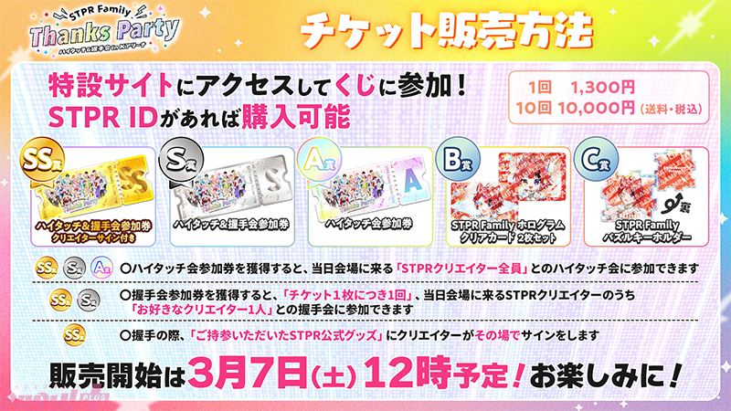 本イベントでは、2026年3月7日(土)12:00より、特設サイトで開始する「オンラインくじ」でチケットを獲得すると参加できる「ファミリーハイタッチ会」および「握手会」を実施します。「ファミリーハイタッチ会」では当日の参加クリエイター全員とのハイタッチが、「握手会」では推しクリエイター1名との握手を楽しめます。「オンラインくじ」はSTPR IDをお持ちであれば(登録無料)購入可能です。
