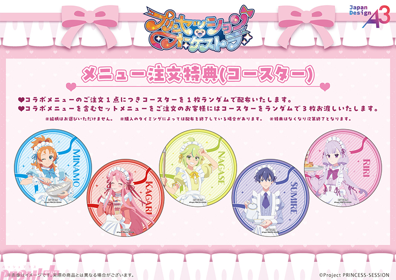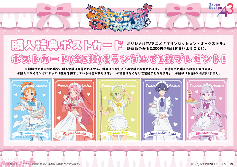 通販、もしくは店頭でTVアニメ『プリンセッション・オーケストラ』の新作グッズのみを1会計で2,200円(税込)お買い上げごとに、ポストカード(全5種)をランダムで1枚プレゼントします。