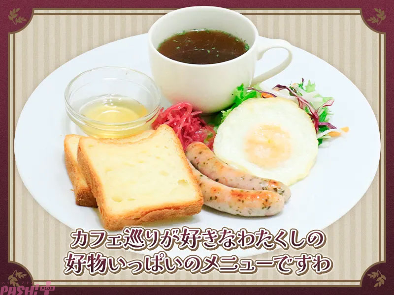 晩餐会を朝夜問わず楽しめるように、モーニングセットをご用意。好物のはちみつを添えたトーストに、香り豊かなハーブソーセージ。目玉焼きとオニオンスープで、朝から少し贅沢なひとときを。ムラサキキャベツのラぺが、彩りとお嬢様らしい気品を添えて。